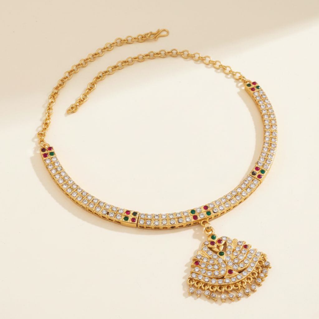 Stone Detailing: The necklace features beautifully embedded shimmering stones. These stones are carefully positioned to reflect light effectively, adding a sparkling finish without being overly flashy.