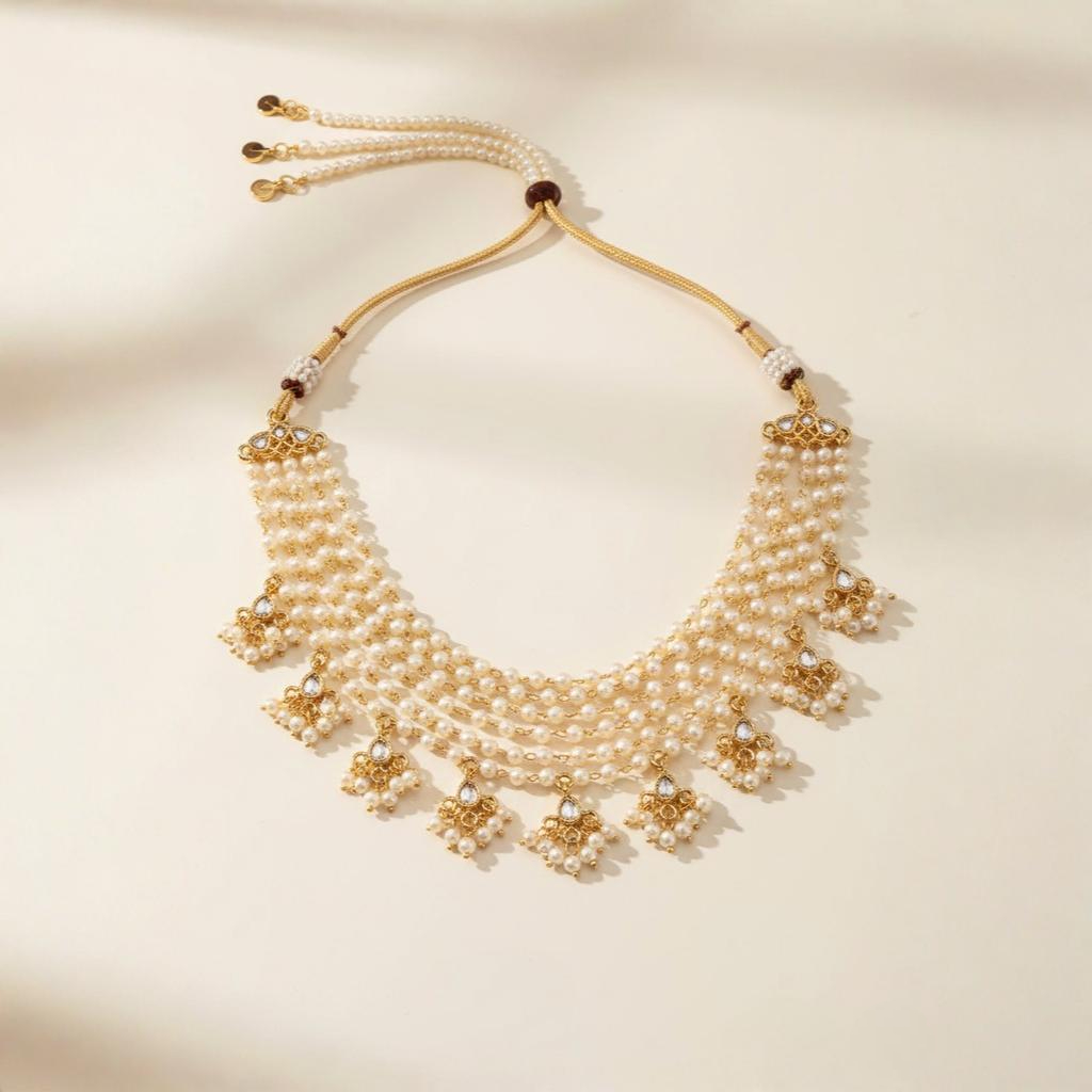 This pearl necklace blends timeless beauty with modern craftsmanship. Its minimal yet elegant design makes it a versatile accessory that can be styled for weddings, festive events, or everyday wear. A perfect combination of metal strength and pearl delicacy, it reflects subtle elegance in every detail.