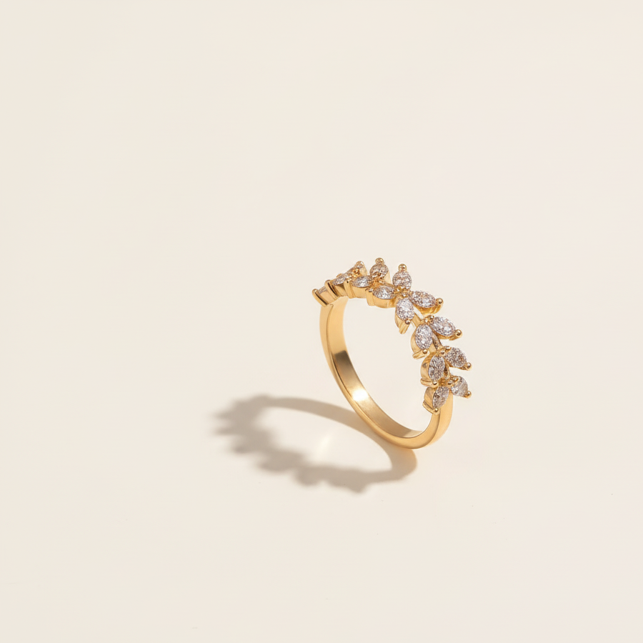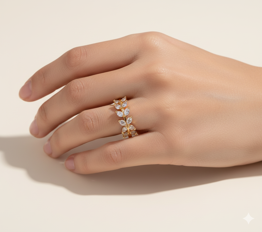 The ring features a clean leaf-inspired pattern that adds texture and visual appeal. Its simple design blends well with both casual and traditional outfits.